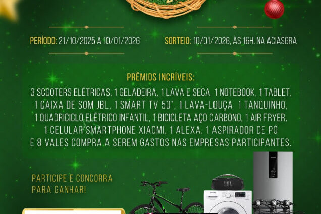 Depósito Construmais, Depósito São Gonçalo, Madema, SICOOB, SICREDI, Supermercado Araújo e Supermercado Amora, apresentam a campanha: *“Natal Premiado Aciasgra 2024”*, a promoção mais esperada do ano! Não fique de fora dessa, pois é o momento de comemorarmos as nossas conquistas e de promovermos o desenvolvimento da economia do nosso município. A cada R$50,00 em compras nas…